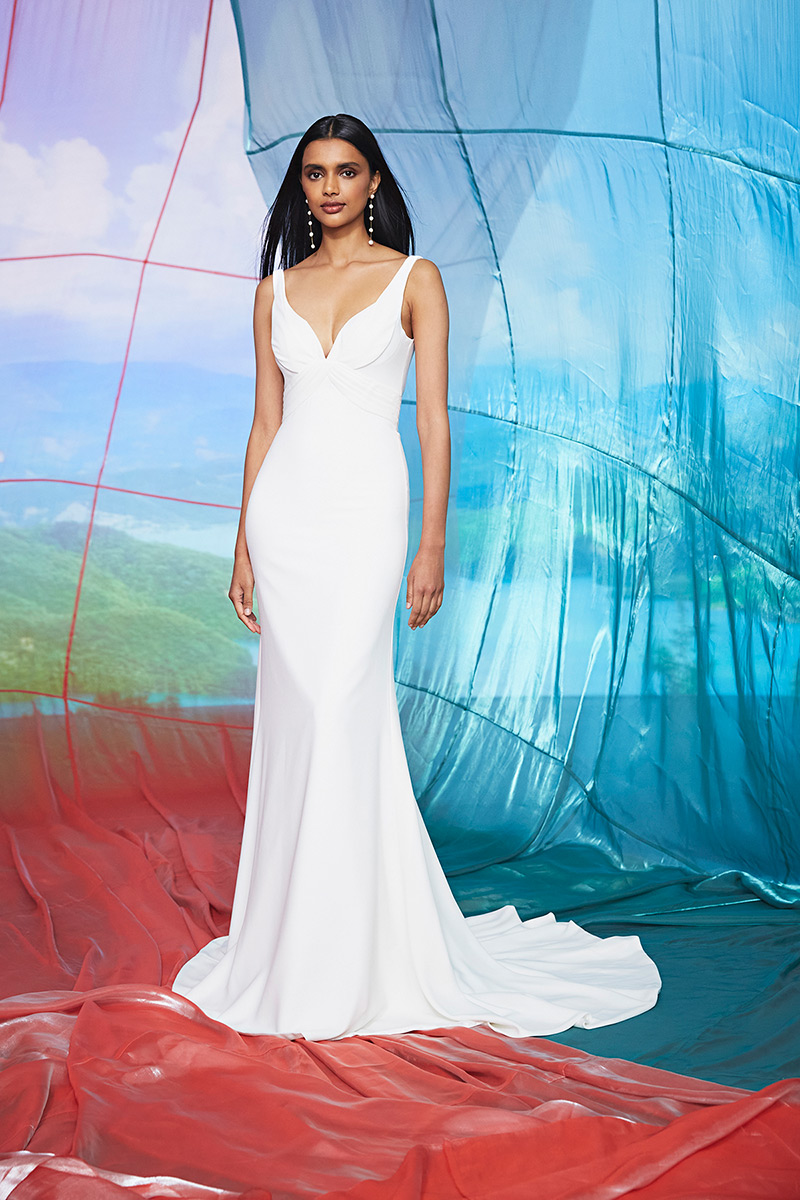 Modified a-line crepe gown with plunging architectural neckline and pleated waist detail.