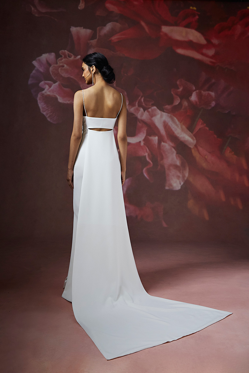 Stretch crepe gown with double side slit peekaboo back and watteau train.