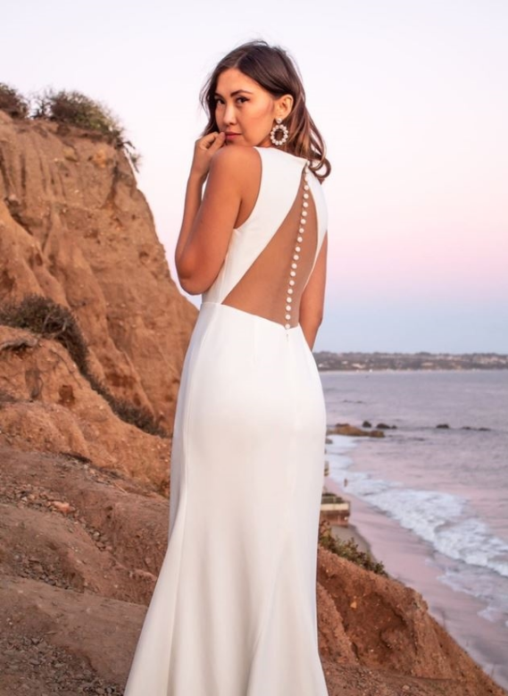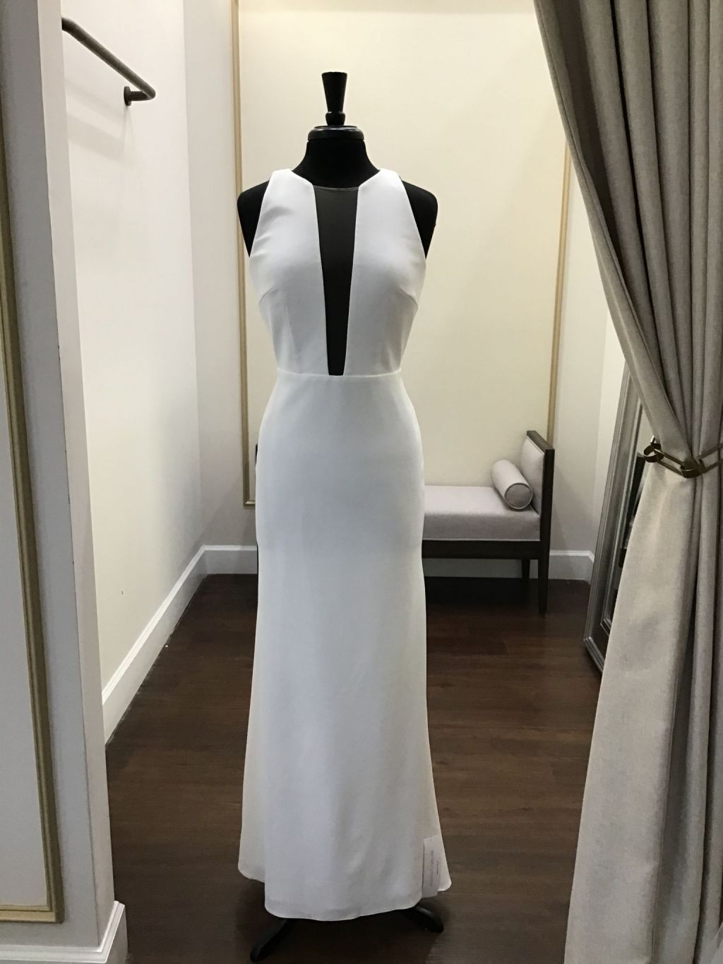 Deep front illusion with an illusion back with buttons. Finished with a puddle train. Gown is brand new and is in excellent condition.