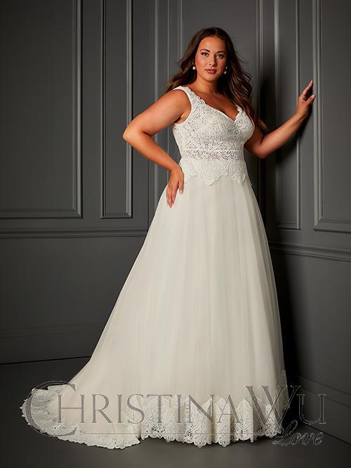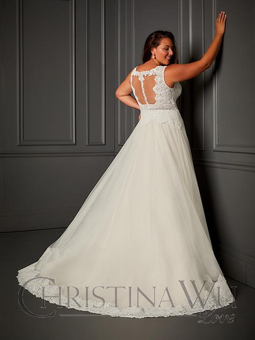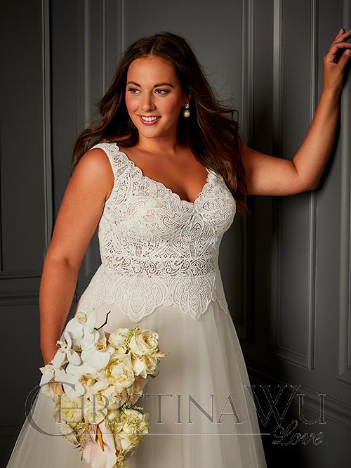 This soft A-line gown features a guipure lace, semi sheer bodice. The lace straps lead to an illusion back that opens and closes with buttons and loops. The soft tulle skirt has been finished with a matching lace border.